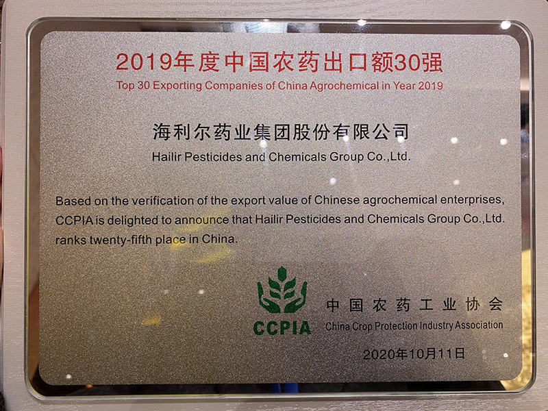 2019年半岛在线体育农药出口再创佳绩。10月11日,由中国农药工业协会主办的第二十届全国农药交流会上,半岛在线体育股份有限公司荣获2019年中国农药出口额30强。