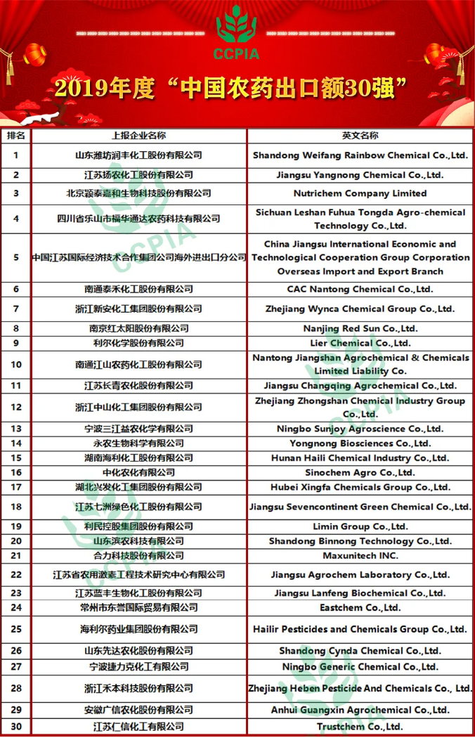 中国农药工业协会组织开展“2019年中国农药出口额30强”活动,是通过对2019年度中国农药企业出口数据进行核对、整理以及对企业发展态势和竞争力等诸方面的分析遴选得出的。活动旨在促进农药出口的健康有序发展,激励企业大力开拓国际市场,提升企业的国际影响力,在行业中树立开拓海外市场标杆,推动农药出口贸易健康、快速、可持续发展。