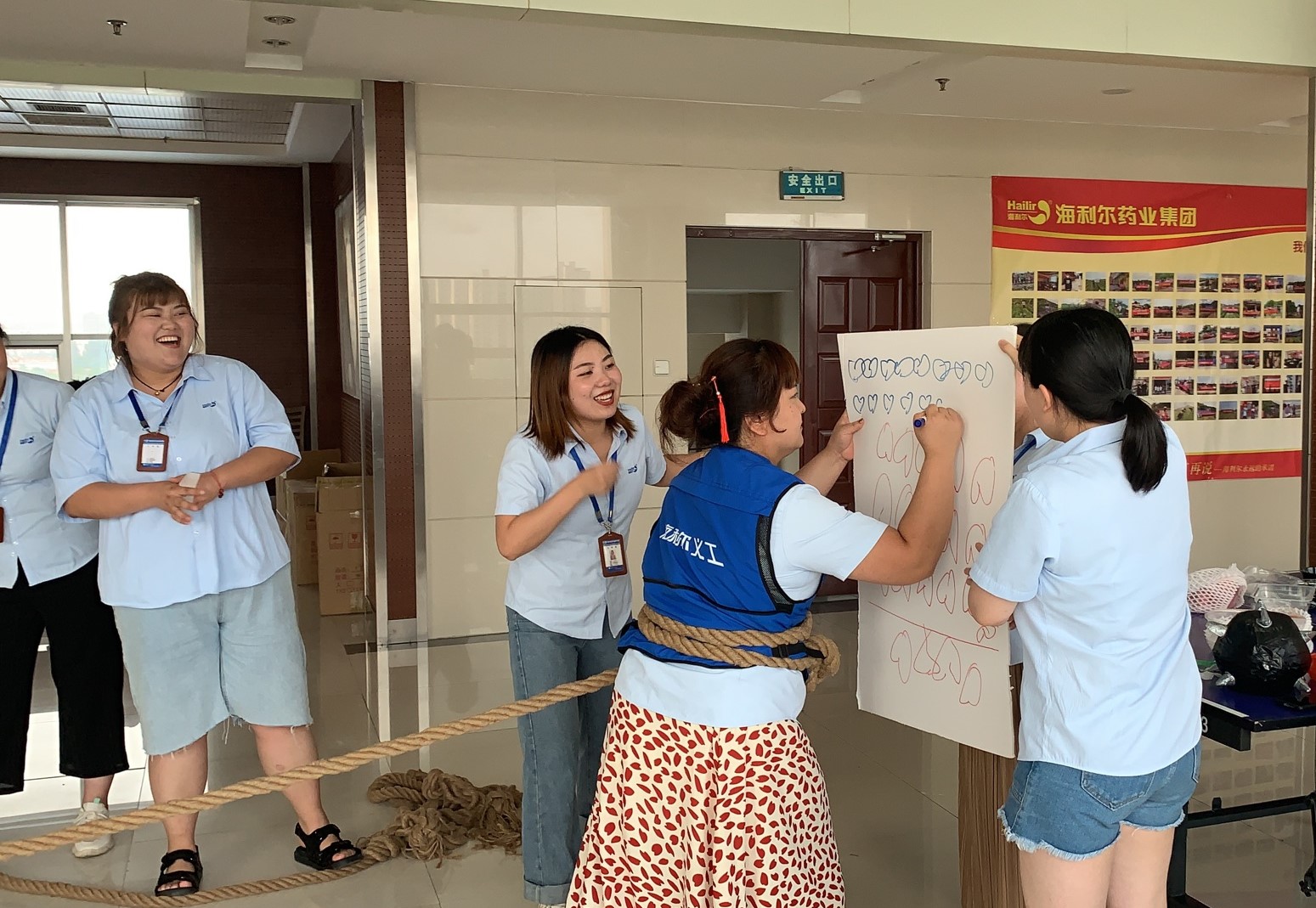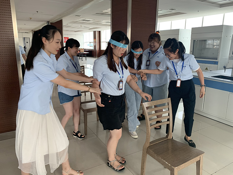 当天下午,集团总部八楼活动室内热火朝天,小伙伴们齐聚一堂,沉浸在“穿针引线”“蒙眼避障”“角力绘画”“智力逃脱”等游戏的欢乐中。